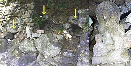 庵から少し登ったところに名前の由来となった風穴があります。 ここは真夏でも冷風が吹き出てくるということで古くから信仰の 対象にされてきました。今でも手を穴に近づけると風が冷たい です。ここにおかれている仏像(上の写真右)は少し変わった 形をしていて、昔 島に来た宣教師を模した物だという人も います。